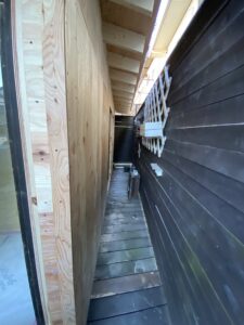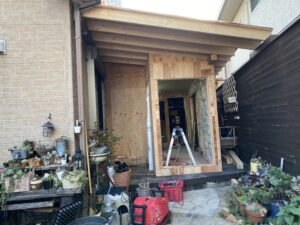 骨組みまでできたので外を合板で補強+仕上げ材の下地として貼っていきます