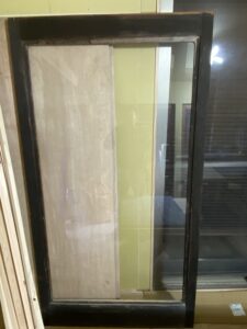 奥様のこだわりの一つ、古民家から持って来たガラスの障子をサッシとしてはめ込んでいきます