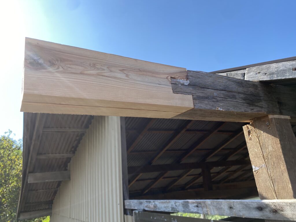 軒先の200mm近くある梁が完全に腐っており、腕を取り付け応急処置をします