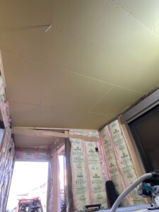 室内は石膏ボードで天井は空間を広く見せるために勾配天井で仕上げます