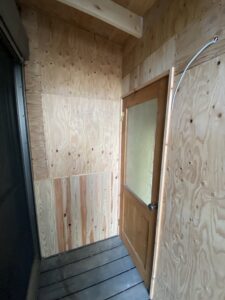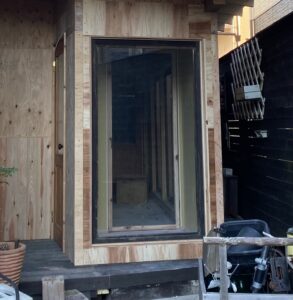 骨組みまでできたので外を合板で補強+仕上げ材の下地として貼っていきます